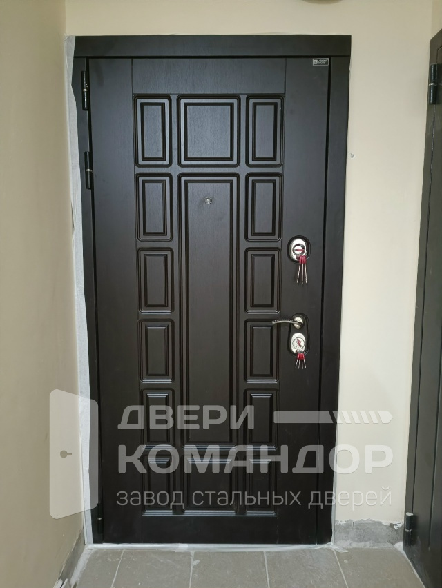 Для квартиры и закрытого подъезда: снаружи тёмная МДФ-панель под венге с глубоким рисунком лабиринт смотрится строго и солидно, маскирует мелкие следы касаний и легко переносит регулярную уборку. Внутри — светлый дуб с тем же рельефом: прихожая визуально светлее, а стойкое покрытие спокойно переносит влажную тряпку и случайные царапины. В версии входной двери New York Лабиринт с расширением и наращиванием проёма короб и доборы аккуратно закрывают широкий проём без «самоделок». Фурнитура — хром, два разнесённых замка с мощными ригелями, броненакладка, изнутри удобный поворотник; глазок на уровне взгляда. Двойной контур уплотнения и противосъёмные штыри на петлевой стороне добавляют тишины и уверенности каждый раз, когда дверь закрывается одним чётким движением.