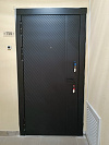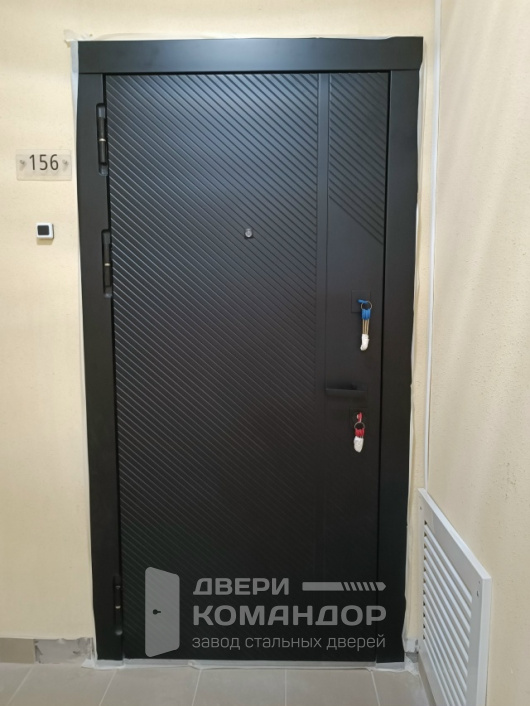 Входная дверь с временной панелью — практичное решение для квартиры во время ремонта: снаружи уже установлена тёмная МДФ-панель с диагональным рельефом и строгой геометрией, внутри — защитная временная плита, закрывающая чистовую облицовку от пыли и ударов; после отделки её заменим на выбранную вами МДФ. Полотно прижимается по двум контурам уплотнения, мягче закрывается и заметно гасит шум из подъезда. Многоточечное запирание уводит ригели по стойке, на петлевой стороне — противосъёмные штыри, глазок обеспечивает обзор. Матовая фактура не бликует и легко отмывается, а дизайн лицевой панели смотрится современно даже на фоне строительной пыли — вход уже «готов», даже если в квартире ещё идут работы.