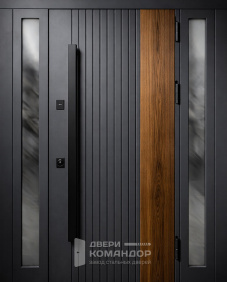 Практичное решение для квартиры и теплого подъезда: снаружи — стойкое молотковое покрытие глубокого черного оттенка, которое скрывает мелкие следы и не боится частых касаний; внутри — МДФ под теплое дерево, добавляющий свет и уют прихожей. На фото видно аккуратную установку «в наклад», плотный контур уплотнения по периметру и дверной глазок на удобной высоте. Черная ручка и накладки смотрятся лаконично, не «шумят» в интерьере. МДФ-панель изнутри гасит звуки и защищает металл от конденсата, а наружная текстура держит царапины и не выцветает в коридорном свете. Ровная притворная линия дает мягкое закрывание без дребезга — дверь садится плотно и уверенно.